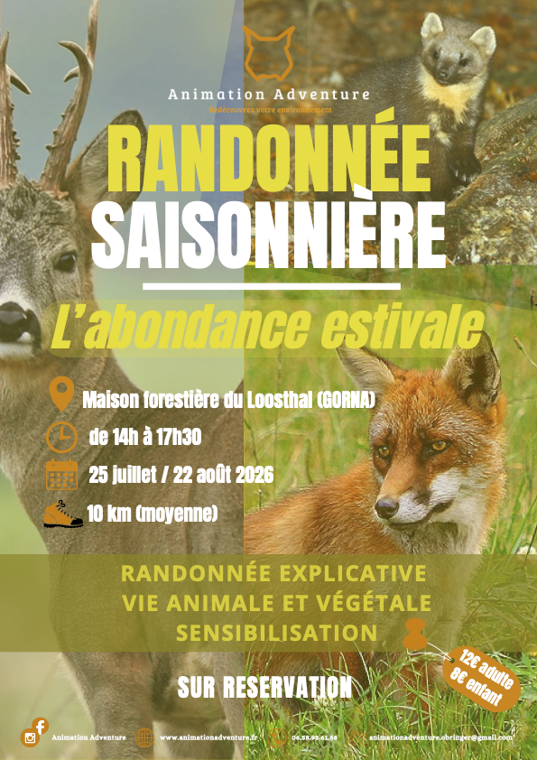 Une randonnée explicative, immersive et interactive à la rencontre des mustélidés ! Du blaireau à la martre, ces petits mammifères sont des éléments clés de la bonne santé de l’écosystème nord vosgien. Sans oublier la diversité de plantes à fleurs, cervidés et oiseaux en tout genre.